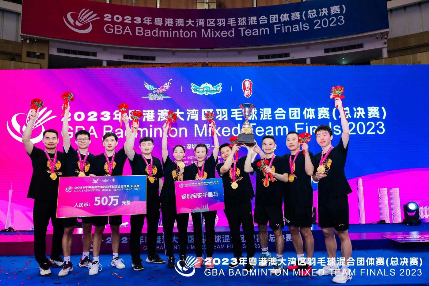 深圳寶安千里馬隊代表寶安區(qū)人民政府參賽,在淘汰賽階段和1/4決賽上分別戰(zhàn)勝了廣東省羽毛球協(xié)會、香港之星羽毛球會,最終以2:0戰(zhàn)勝馬來西亞LCBA隊問鼎灣區(qū)之巔,奪得2023年粵港澳大灣區(qū)羽毛球混合團體賽(總決賽)總冠軍。
