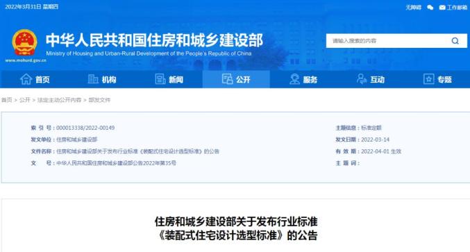 3月31日,住房和城鄉建設部發布行業標準《裝配式住宅設計選型標準》,編號為JGJ/T494-2022,自2022年4月1日起實施。該標準適用于裝配式混凝土結構和裝配式鋼結構的住宅設計。