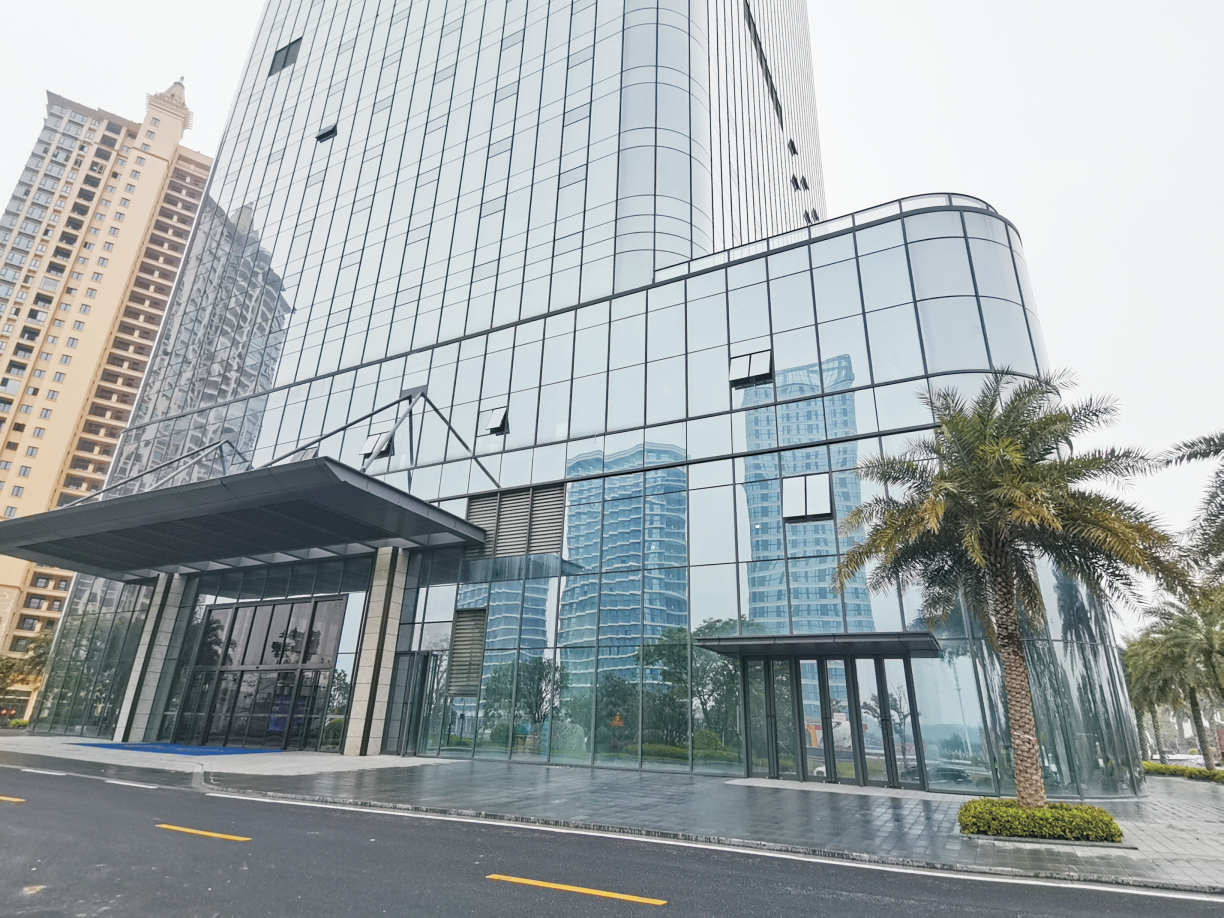 本建筑高度150米,玻璃幕墻面積共36000平方米,采用框架式隱框結構。